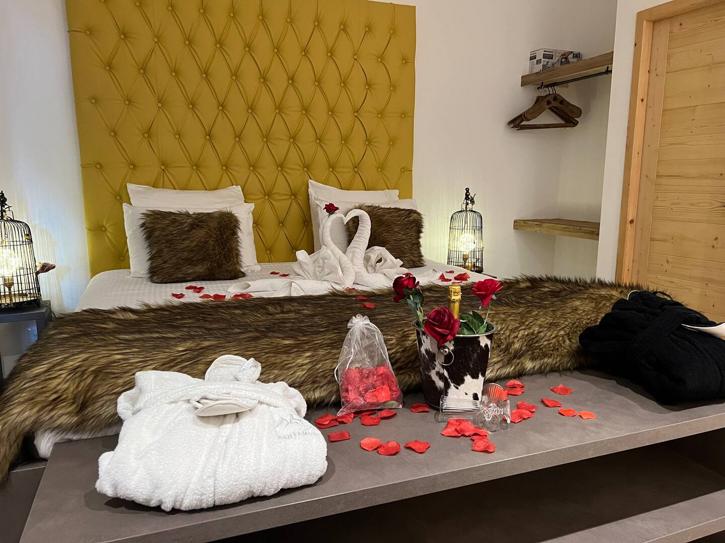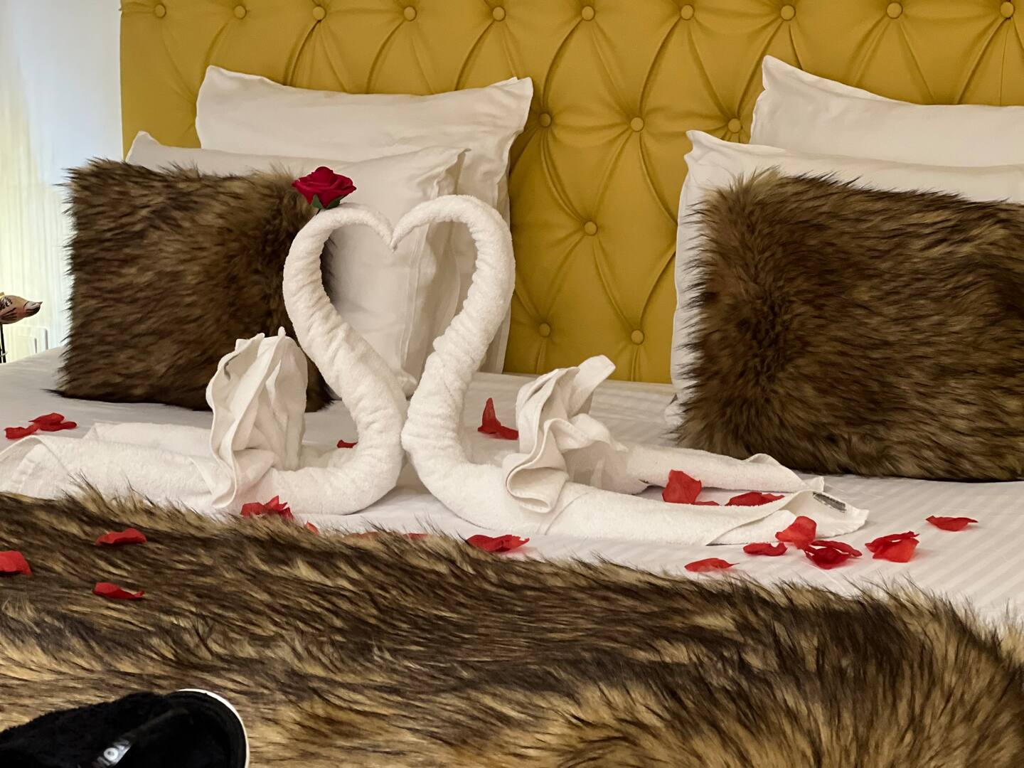 This option includes a romantic decoration of rose petals and a bottle of Prosecco.