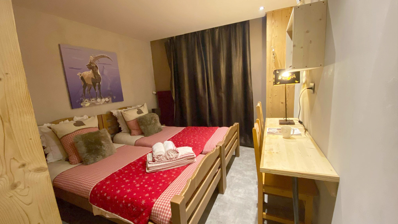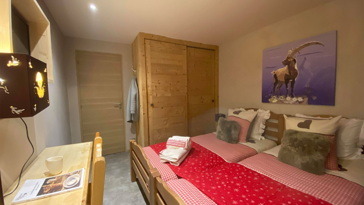 • Bedroom 4: 2 single beds with a window overlooking the mountains.