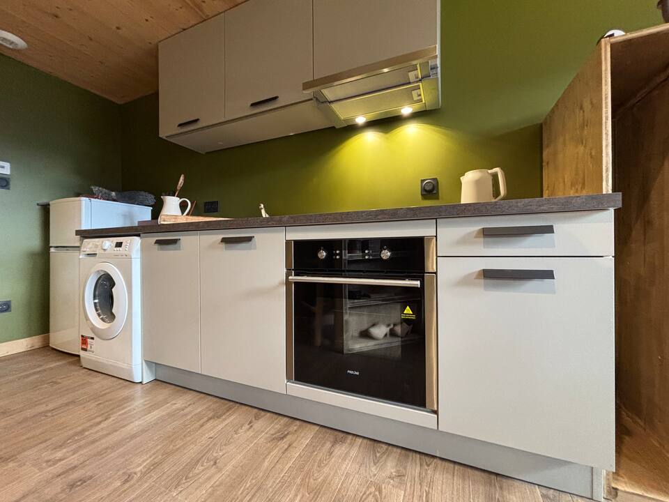 A fully equipped kitchen: stovetop, refrigerator, oven, kettle, Nespresso coffee machine, and washing machine.