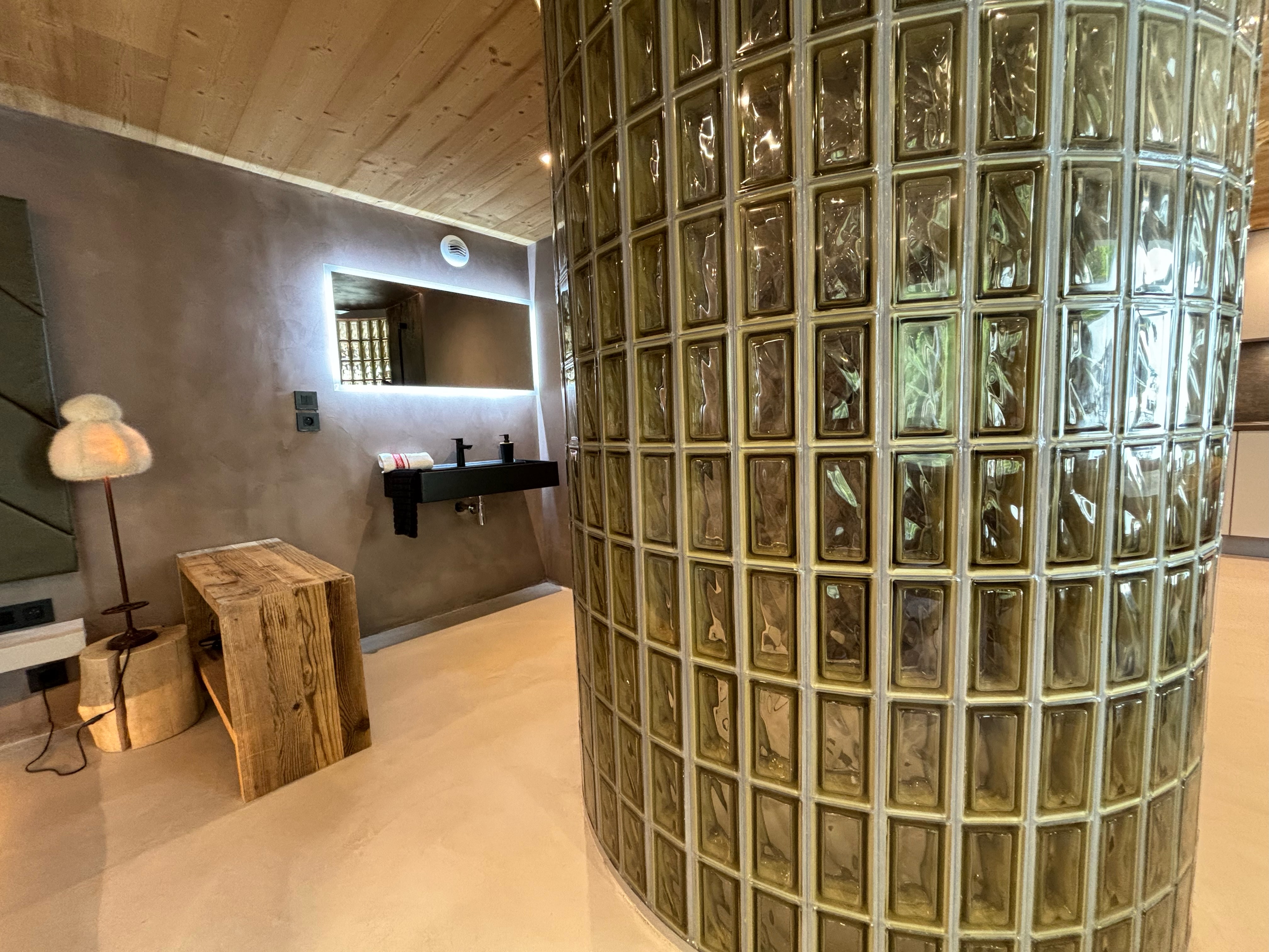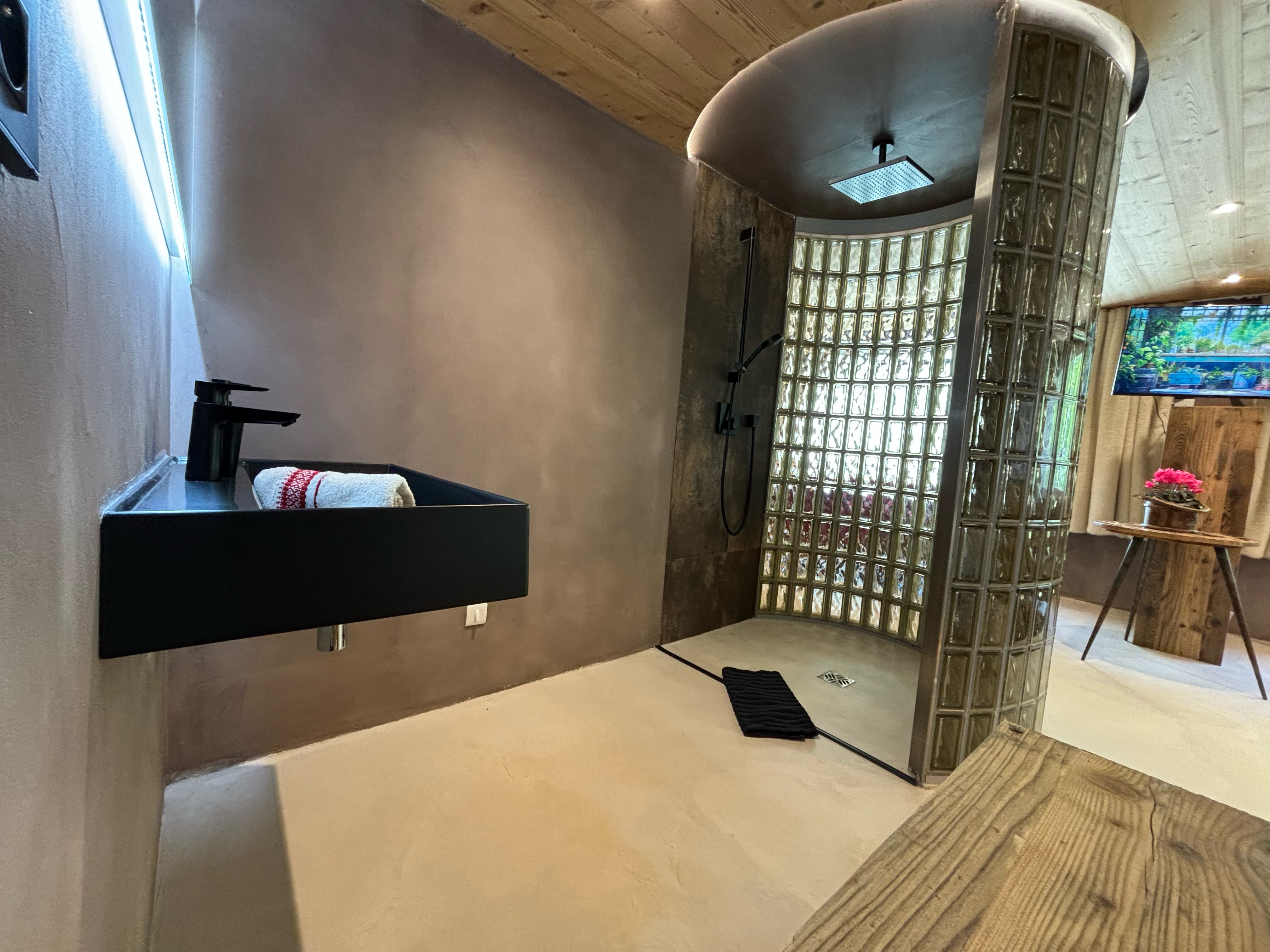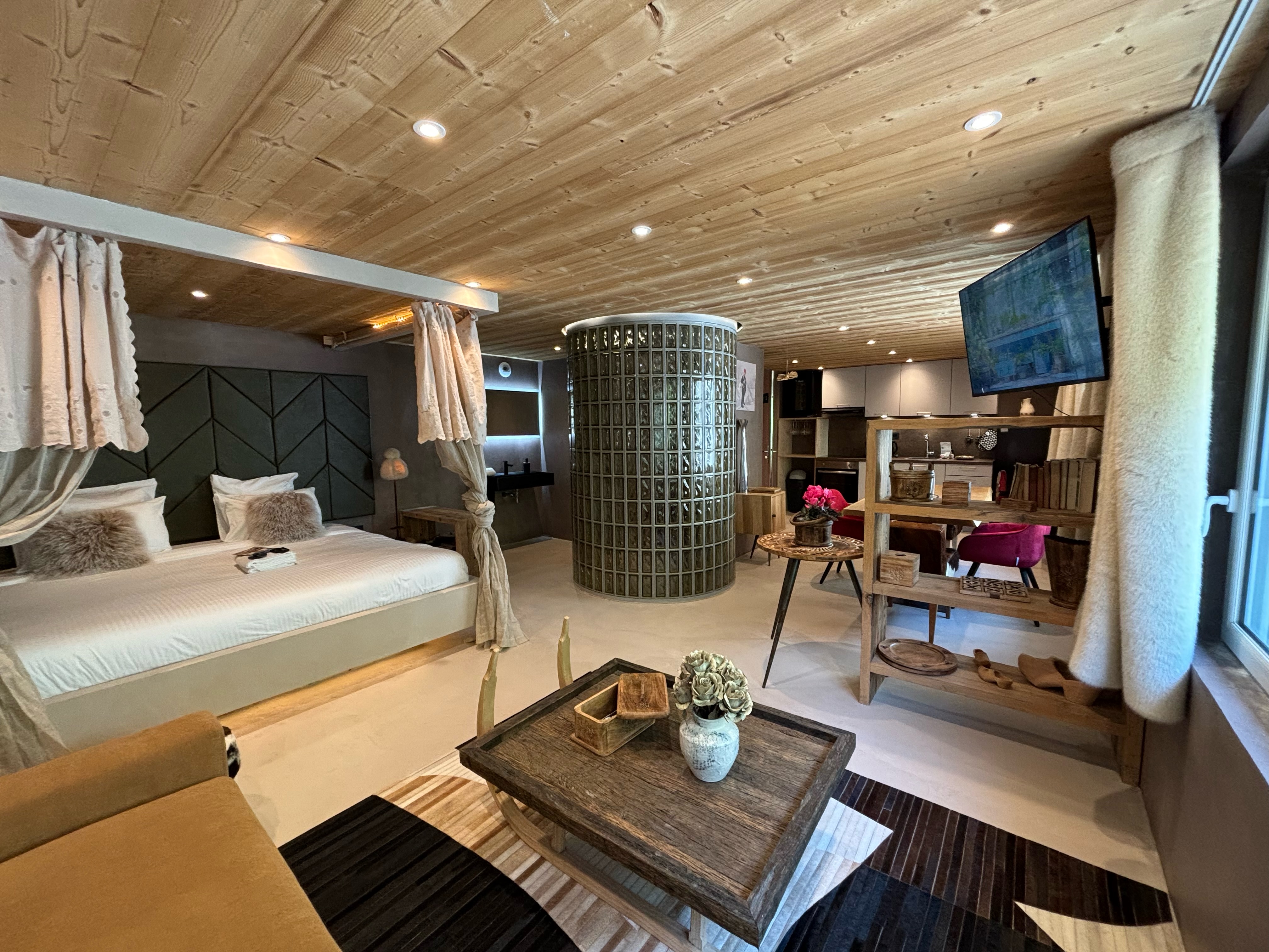 The access to this loft is on the ground floor, unfolding seamlessly on the same level. It features a spacious double bed with a romantically designed canopy, opening into a bathroom with a shower and unique glass brick design. The toilet is in a separate room with stylish black design elements. The open-plan living room provides a view of the outside, the pine forest, adorned with a sofa, while the dining area, also open-plan, boasts a generously sized table. Lastly, the sleek and open kitchen, fully equipped, completes the ensemble of the loft, providing everything necessary for your stay.