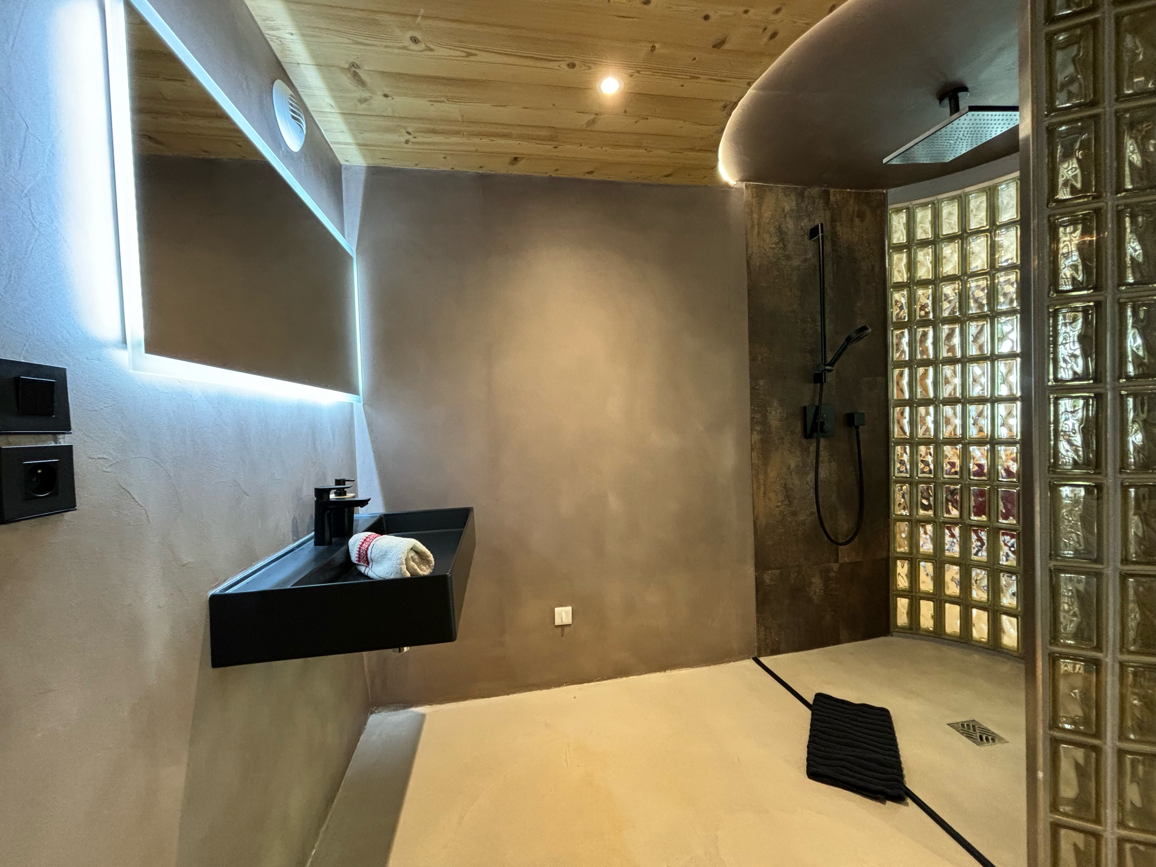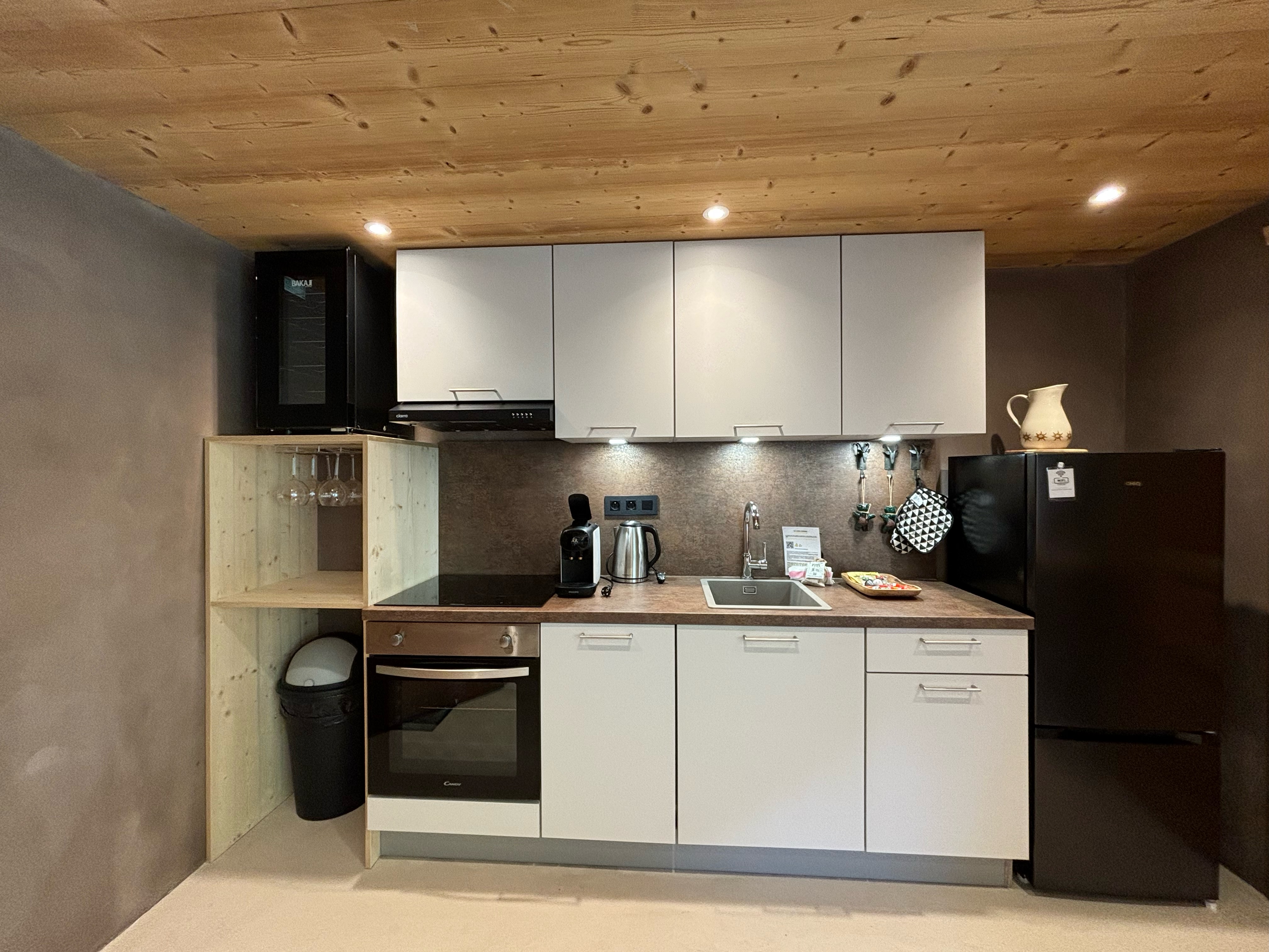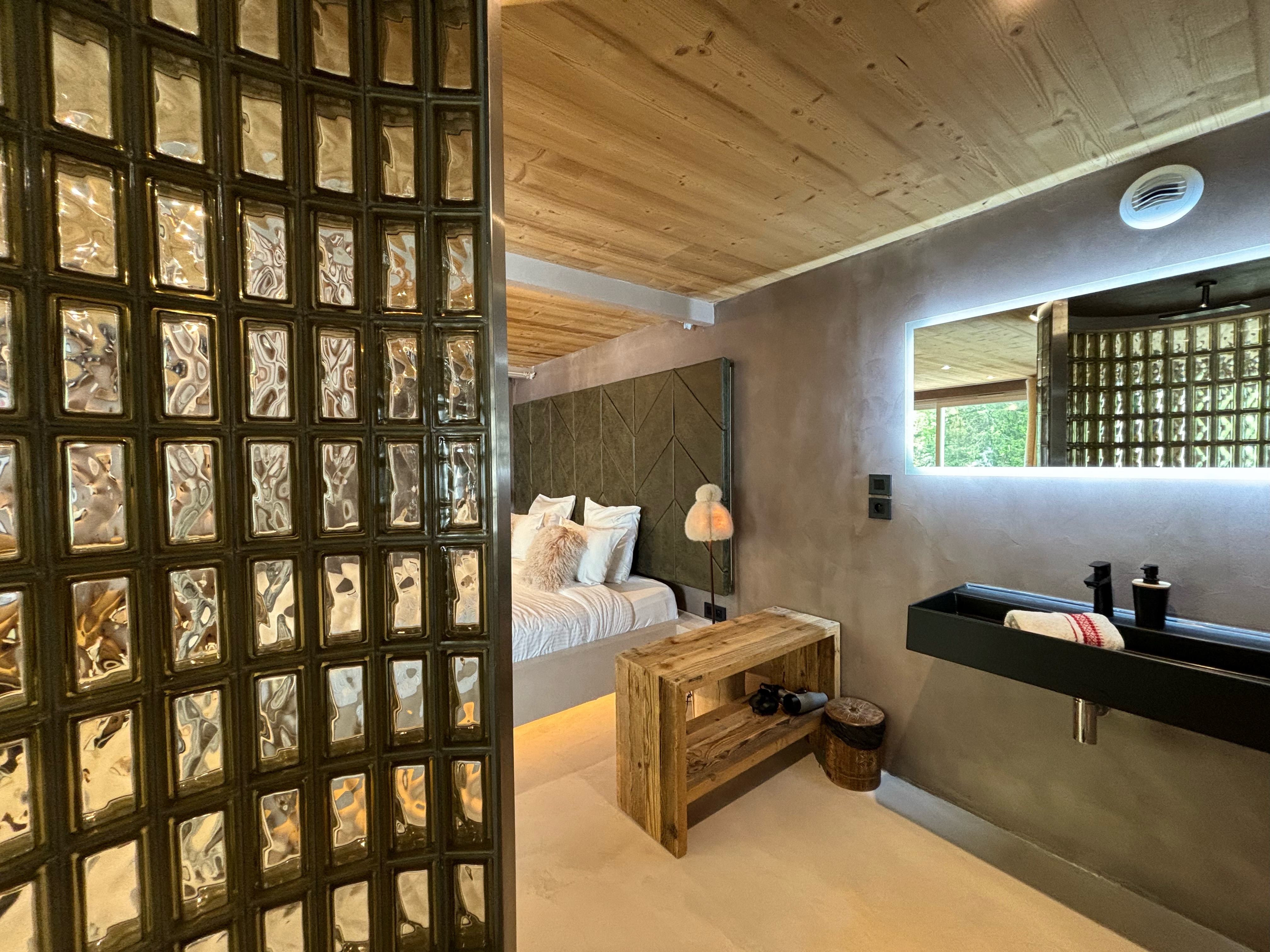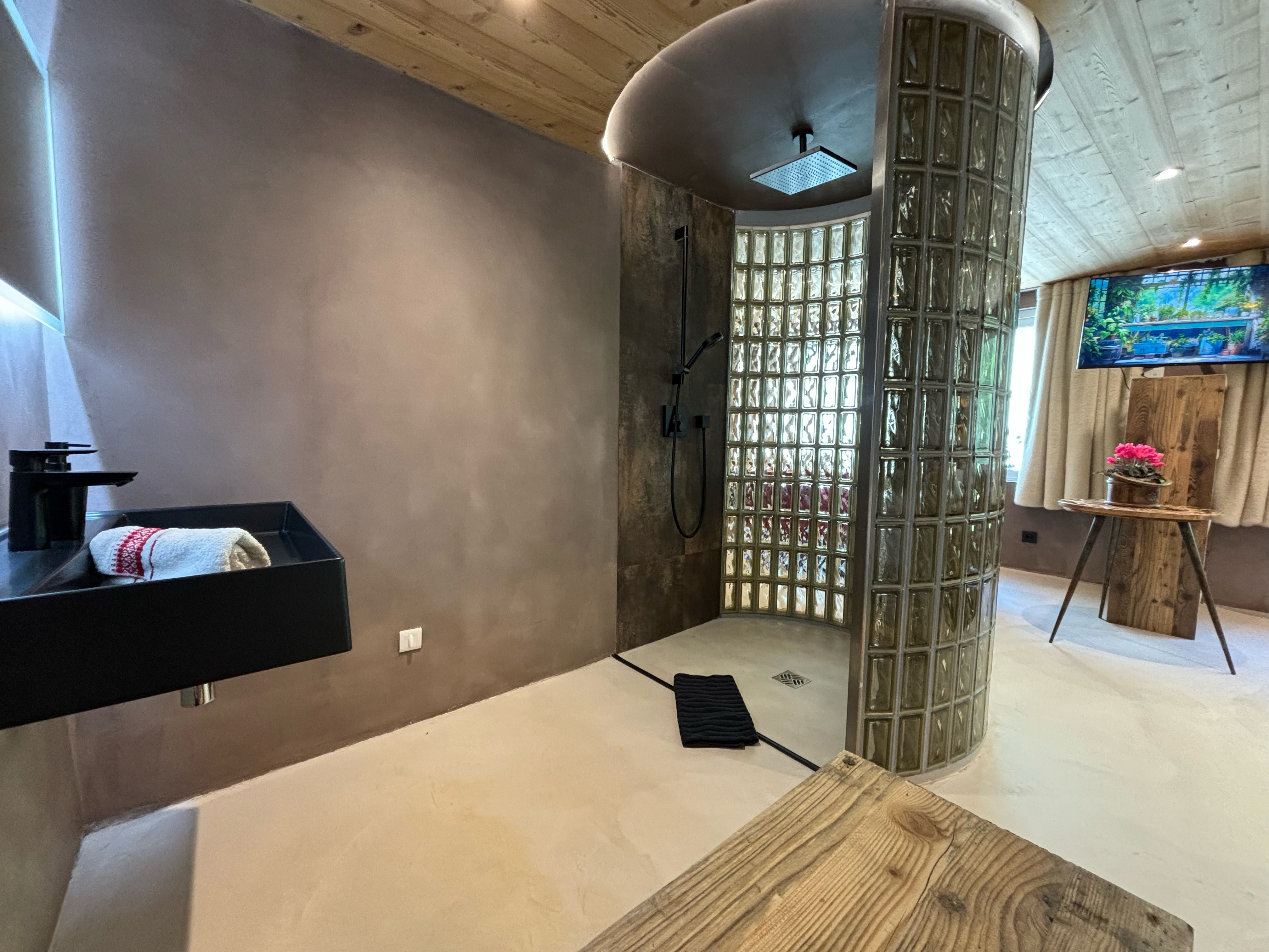 The access to this loft is on the ground floor, unfolding seamlessly on the same level. It features a spacious double bed with a romantically designed canopy, opening into a bathroom with a shower and unique glass brick design. The toilet is in a separate room with stylish black design elements. The open-plan living room provides a view of the outside, the pine forest, adorned with a sofa, while the dining area, also open-plan, boasts a generously sized table. Lastly, the sleek and open kitchen, fully equipped, completes the ensemble of the loft, providing everything necessary for your stay.