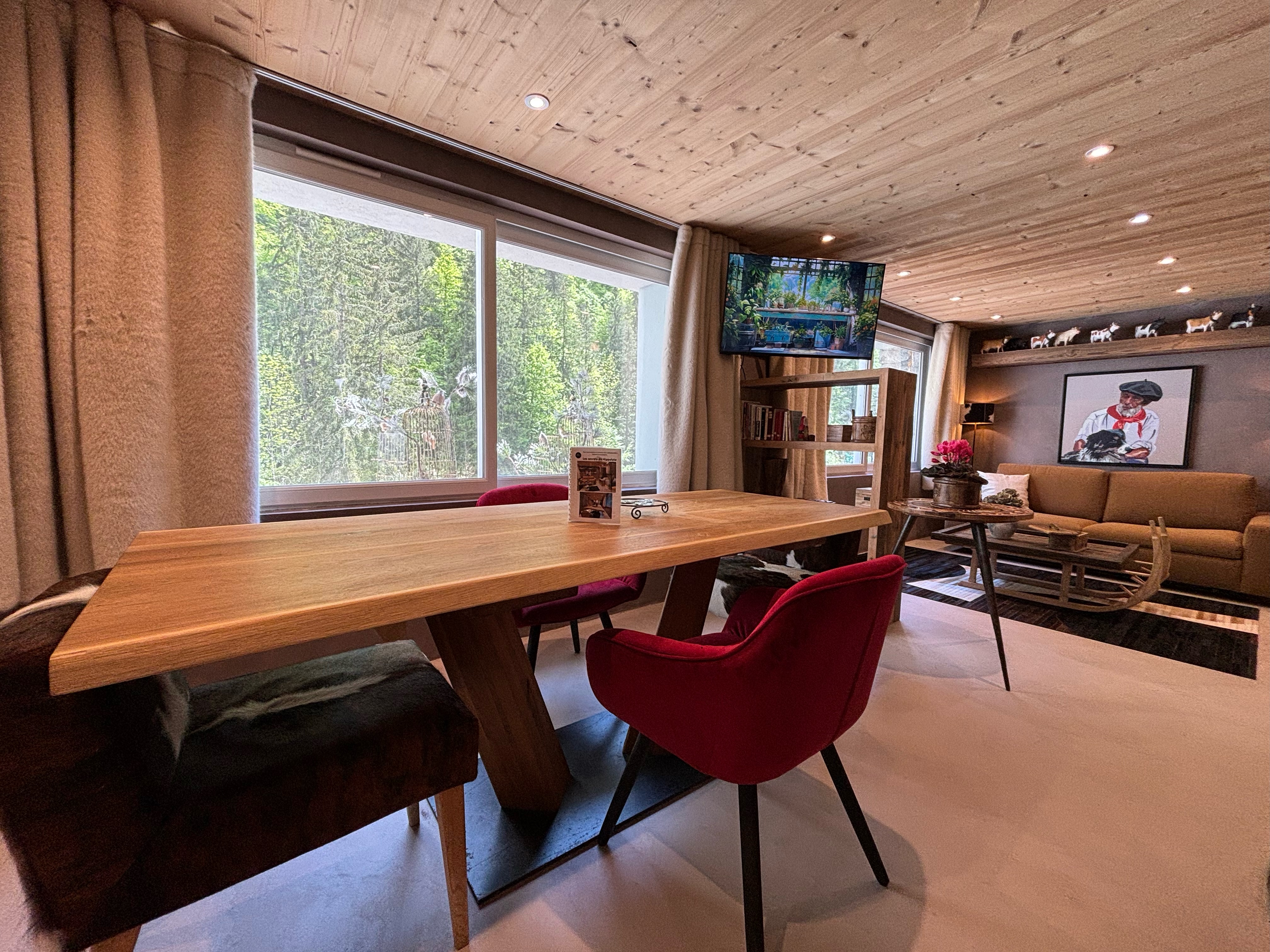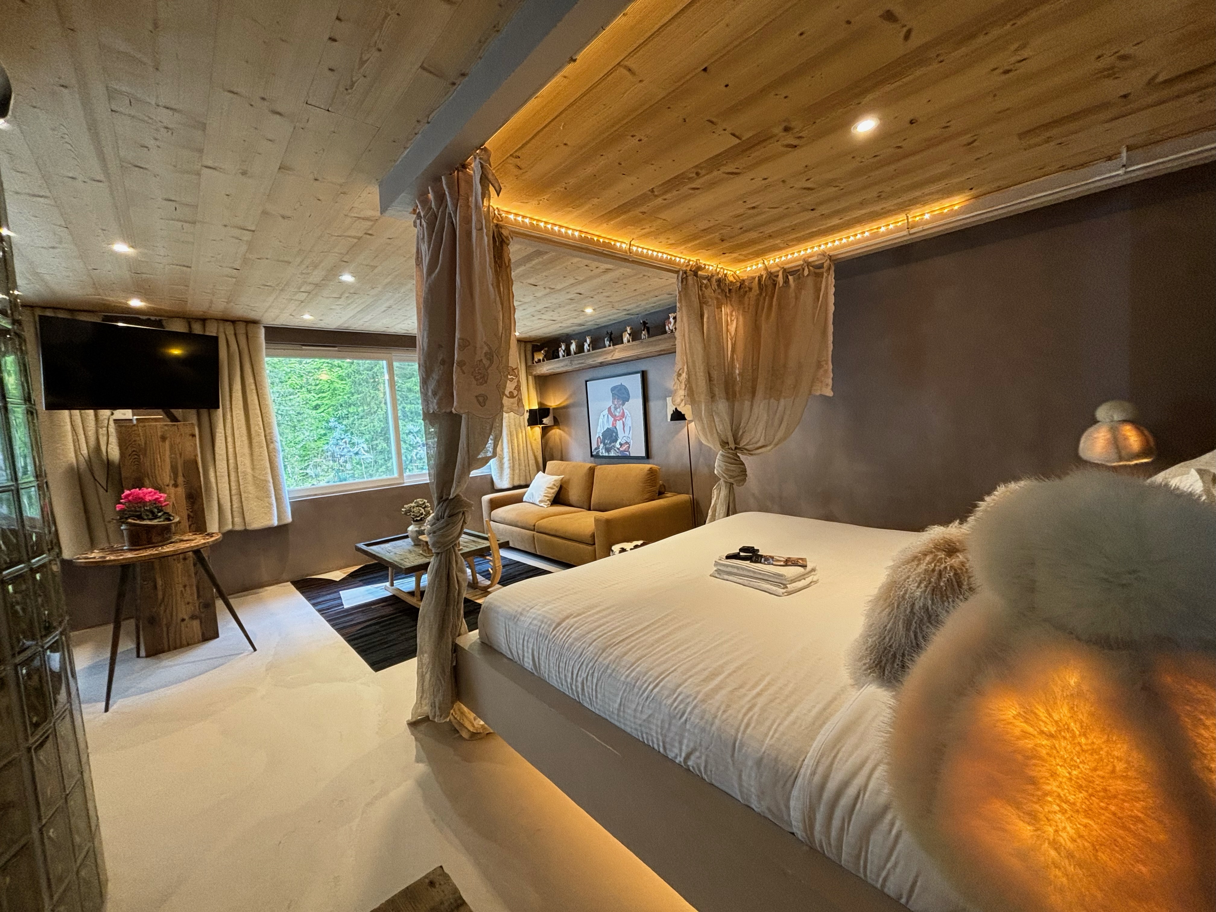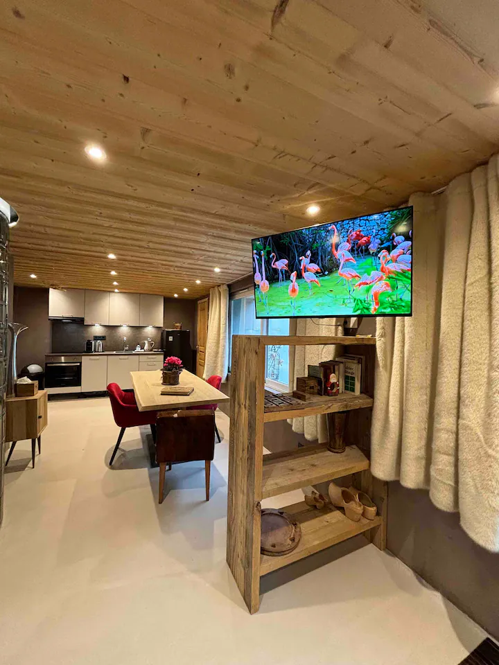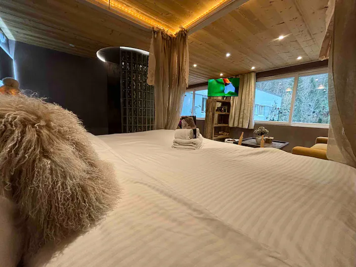 This enchanting loft, Les Secrets d’Hyppolite, boasts an expansive open-plan living area offering breathtaking views of the majestic pine forest, a sight to behold throughout the seasons. The generous dining space invites intimate gatherings, while the well-equipped open kitchen fulfills every culinary aspiration for your romantic mountain retreat. Step outside to the outdoor jacuzzi area, where relaxation knows no bounds, accessible daily from 7:30 a.m to 9:30 p.m, offering a serene sanctuary regardless of the season.