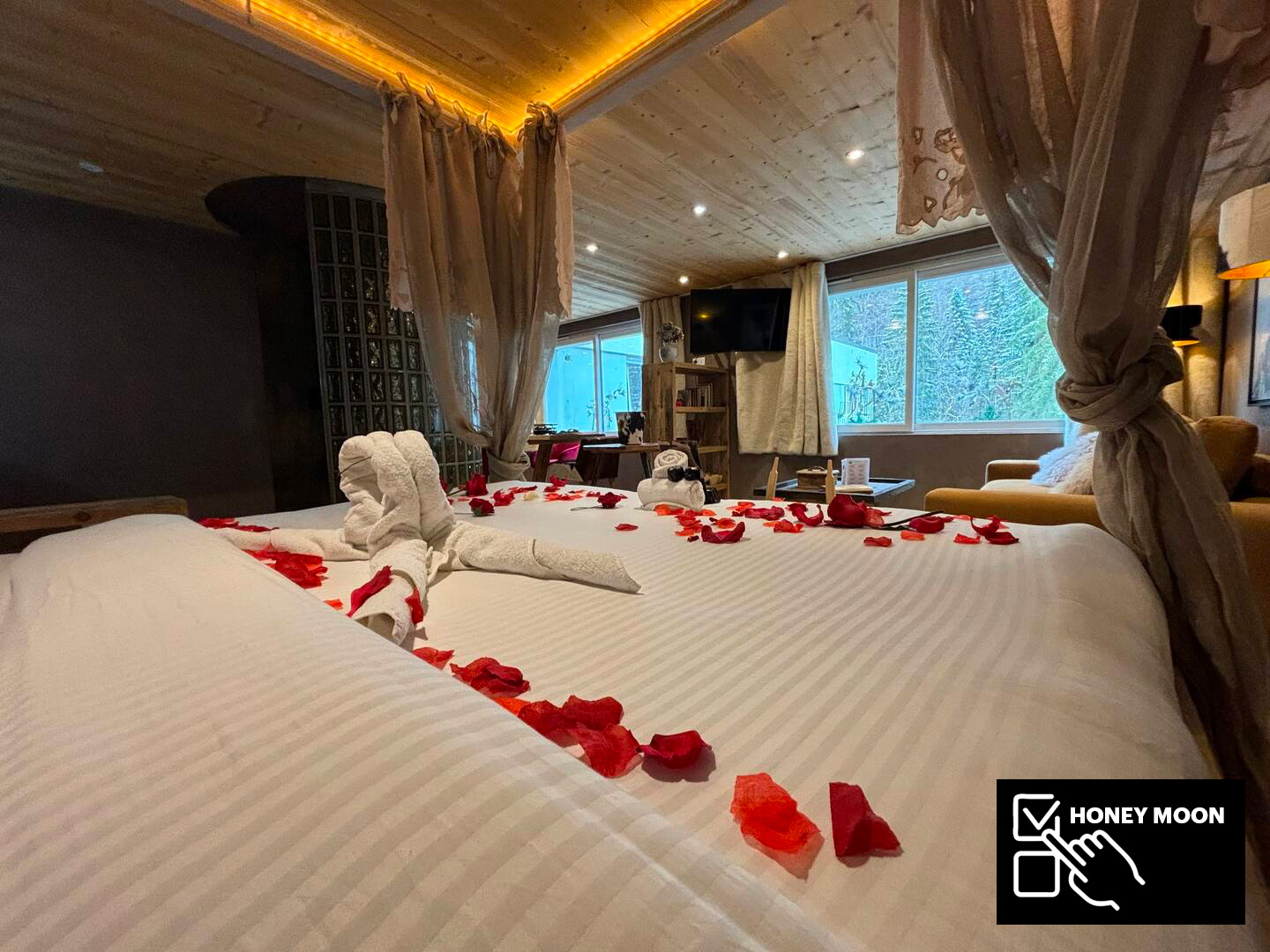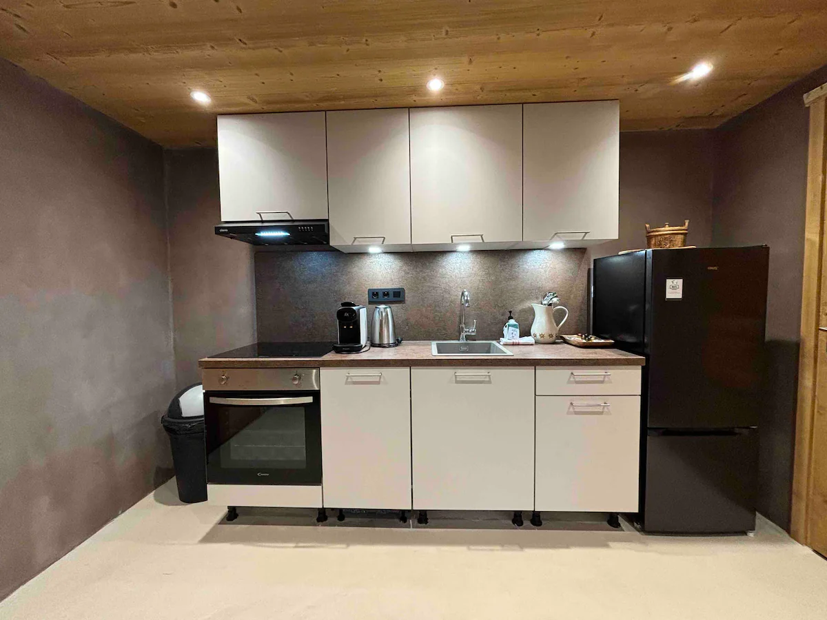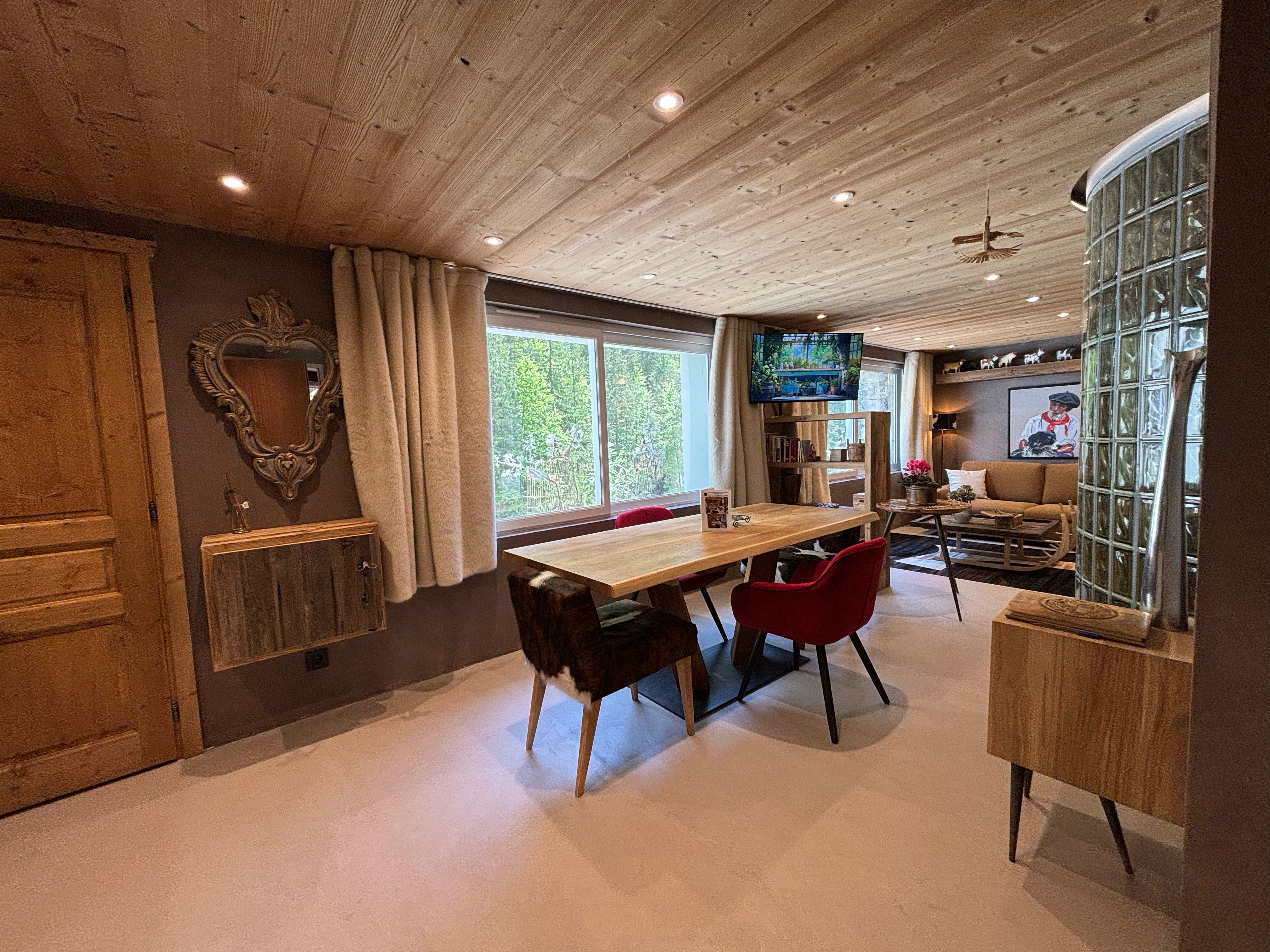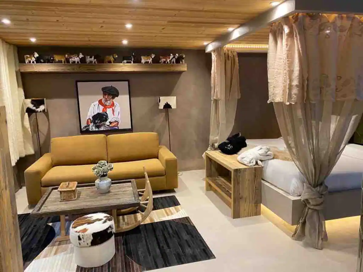This enchanting loft, Les Secrets d’Hyppolite, boasts an expansive open-plan living area offering breathtaking views of the majestic pine forest, a sight to behold throughout the seasons. The generous dining space invites intimate gatherings, while the well-equipped open kitchen fulfills every culinary aspiration for your romantic mountain retreat. Step outside to the outdoor jacuzzi area, where relaxation knows no bounds, accessible daily from 7:30 a.m to 9:30 p.m, offering a serene sanctuary regardless of the season.