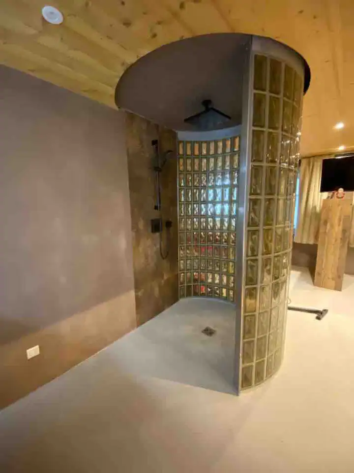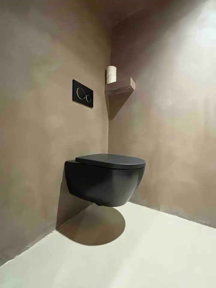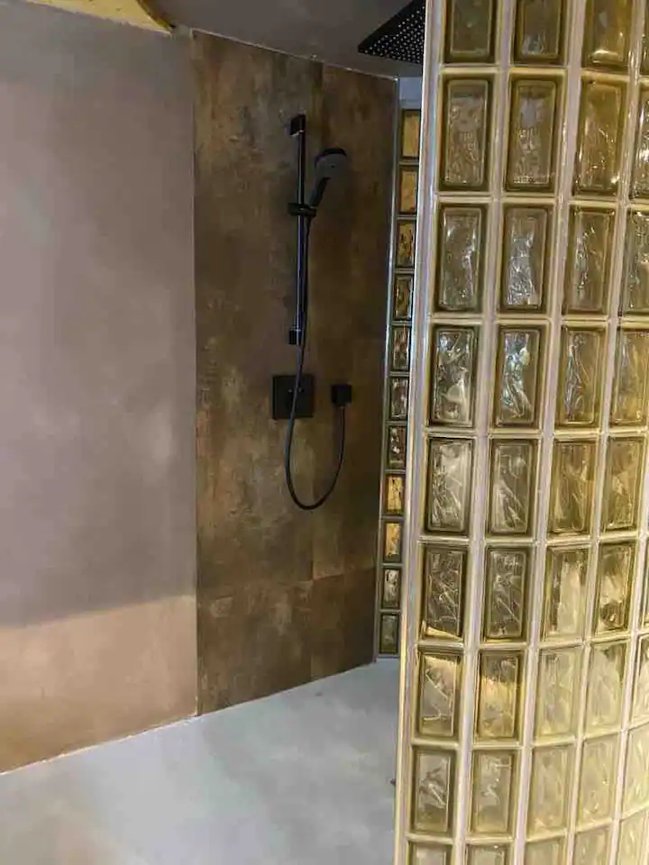 Indulge in the opulence of a bathroom ensconced in glass, where a rejuvenating shower awaits amidst a backdrop of pure sophistication. A touch of allure is found in the stylish black toilet, adding a dash of intrigue to your private oasis.