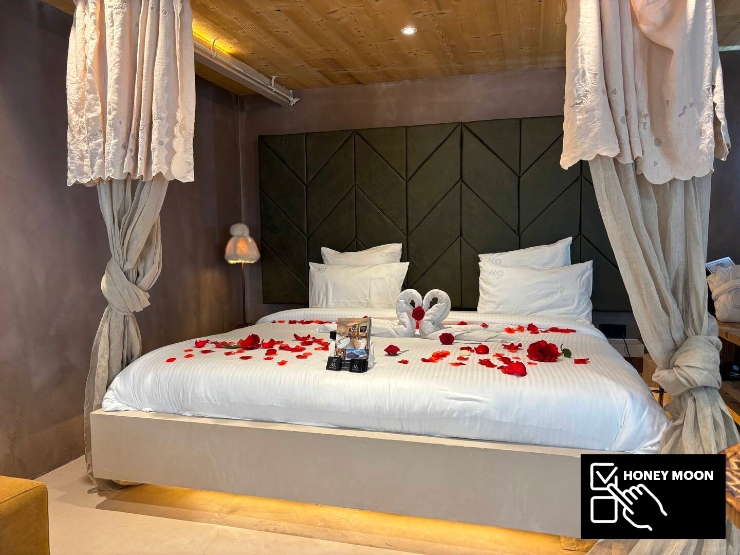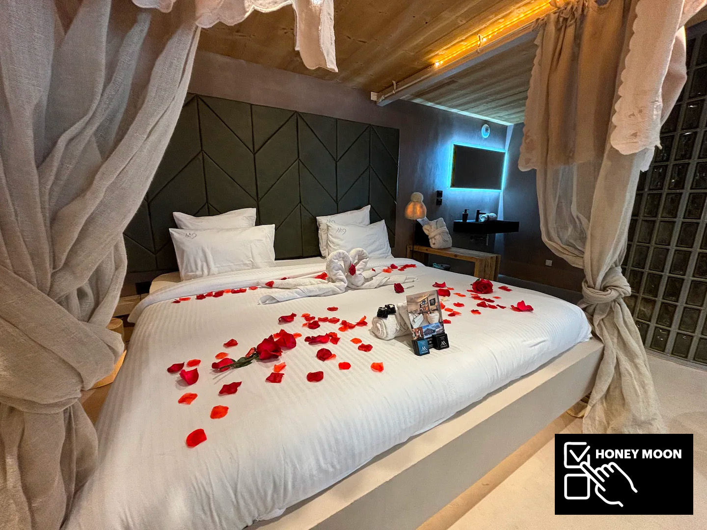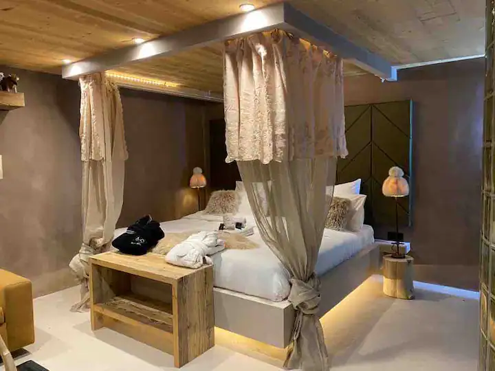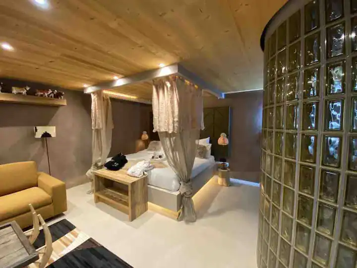 As evening falls, retire to the cocooning embrace of the bedroom, adorned with a romantically designed baldaquin canopy enveloping a sumptuously large double bed. Here, amidst the soft glow of ambient lighting, love finds its perfect sanctuary.
