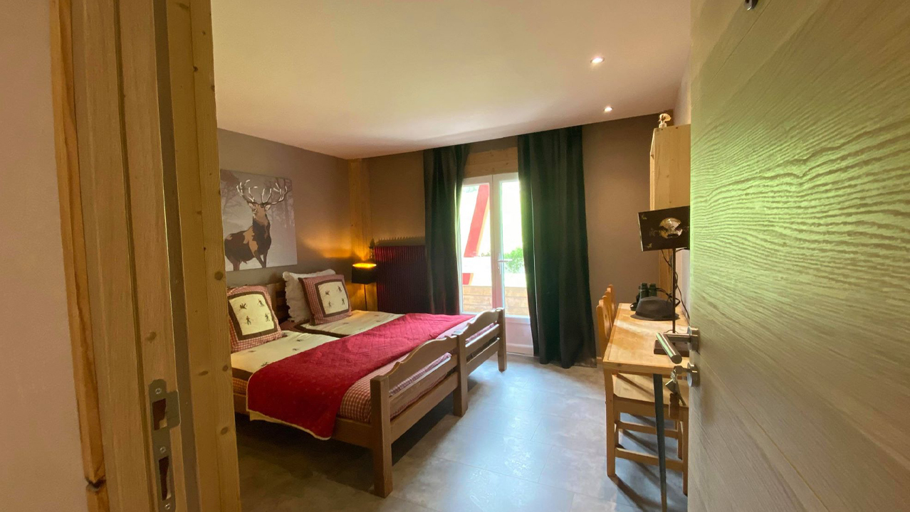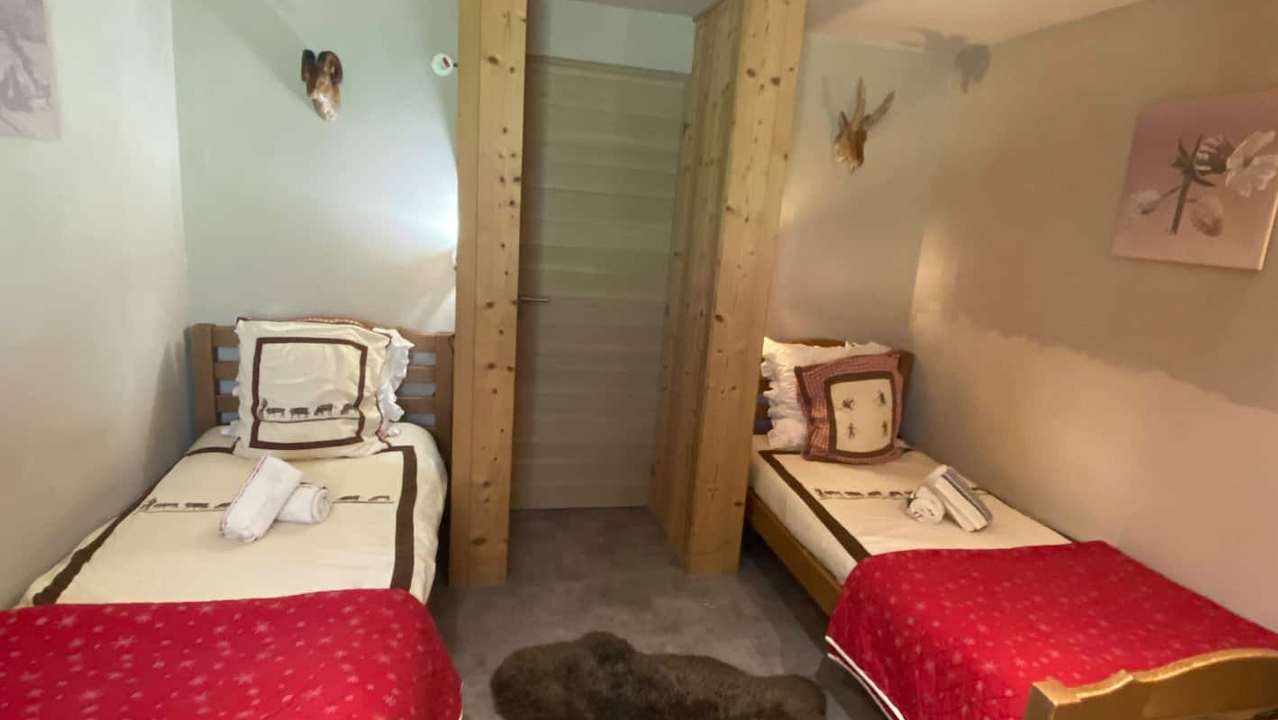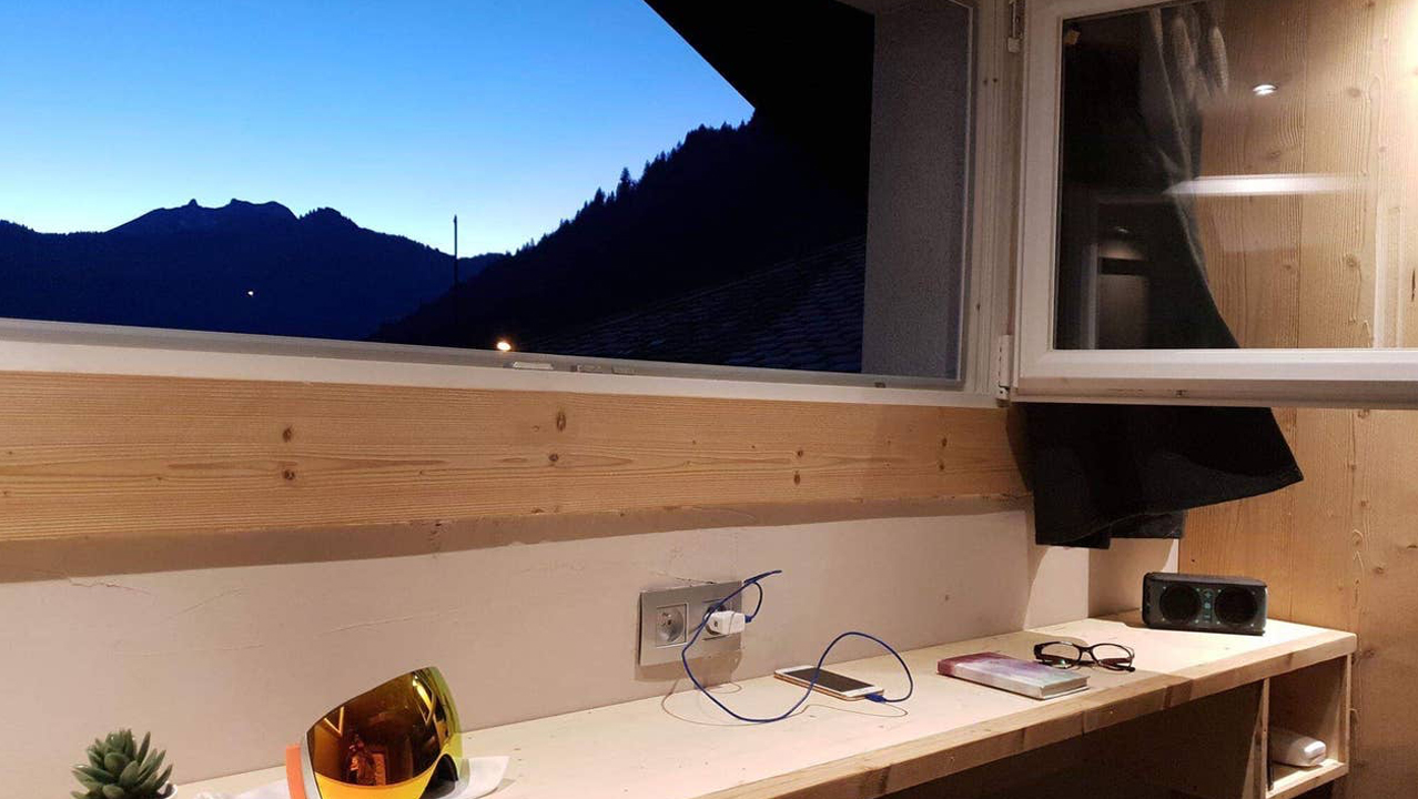 - Bedroom 4: 2 single beds with a window overlooking the mountains.